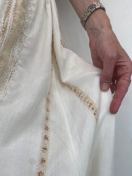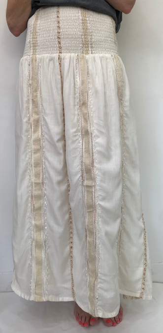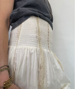 Jupe à volutes et ceinture froncée et smocks à la taille, 100% viscose artisanale rayures brodées et lurex fond écru. Tissu en série limitée.
