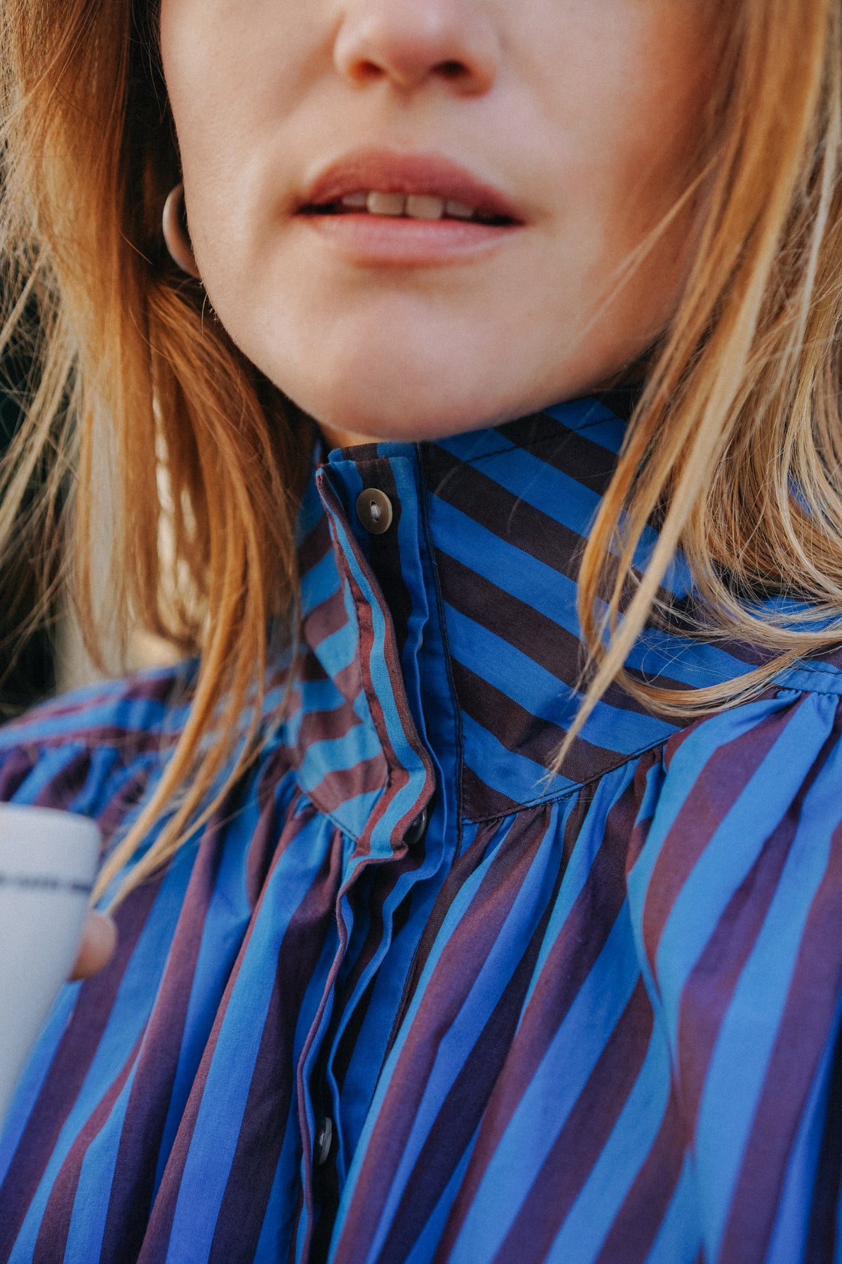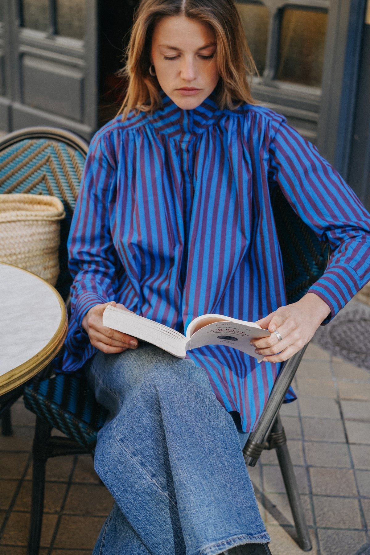 Blouse ample, col officier montant avec patte invisible de boutonnage. Dos fronces et manches resserrées. En tissu rayé bleu et aubergine.