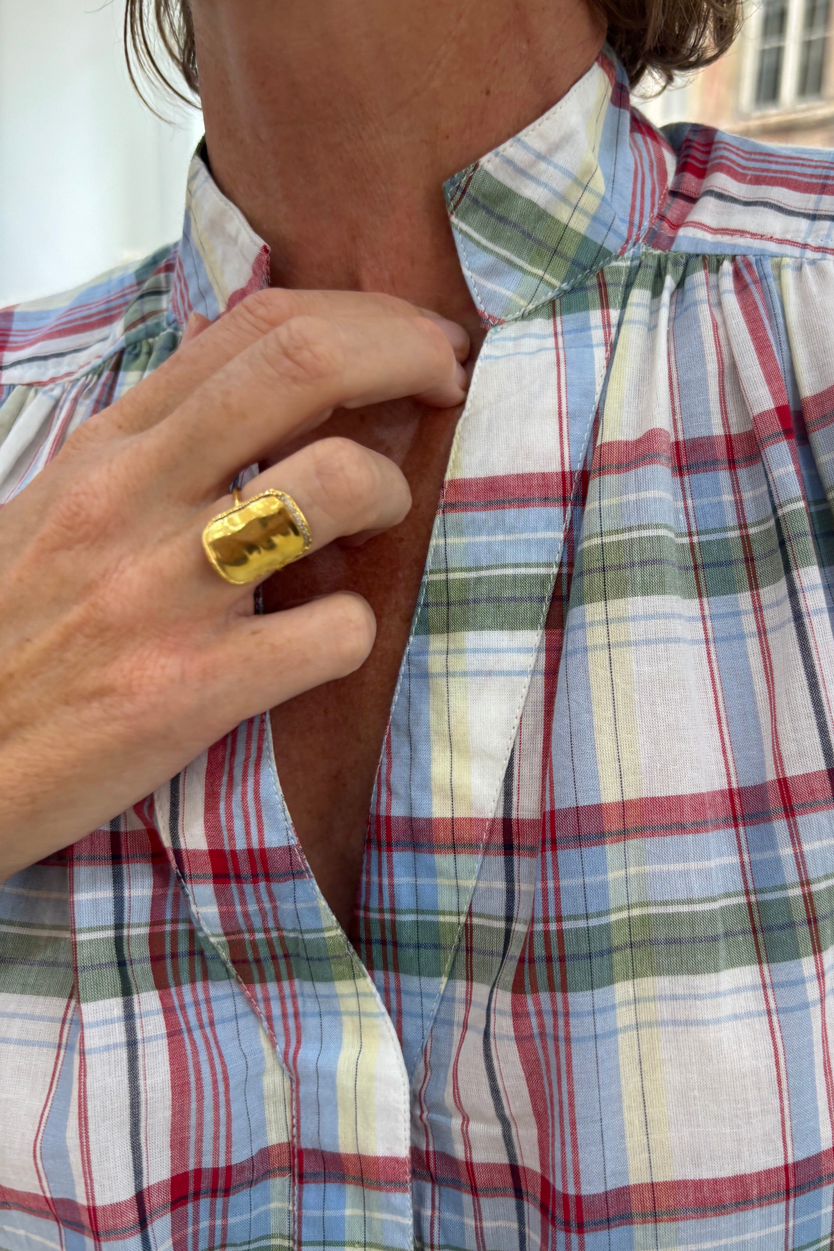 Blouse sans manches avec boutons en nacre sur le devant. Empiècement épaules avec fronces sur l’avant, col mao et revers sur la manche. Dans un tissu écossais bleu, vert et rouge.