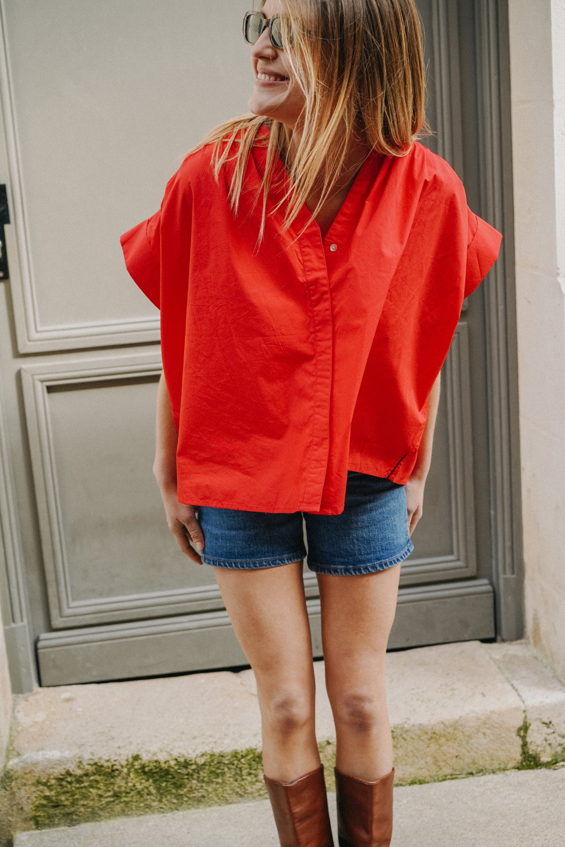 Blouse sans manches avec boutons en nacre sur le devant. Empiècement de fronces au dos et à l’avant, col mao et application de dentelle sur l’épaule.