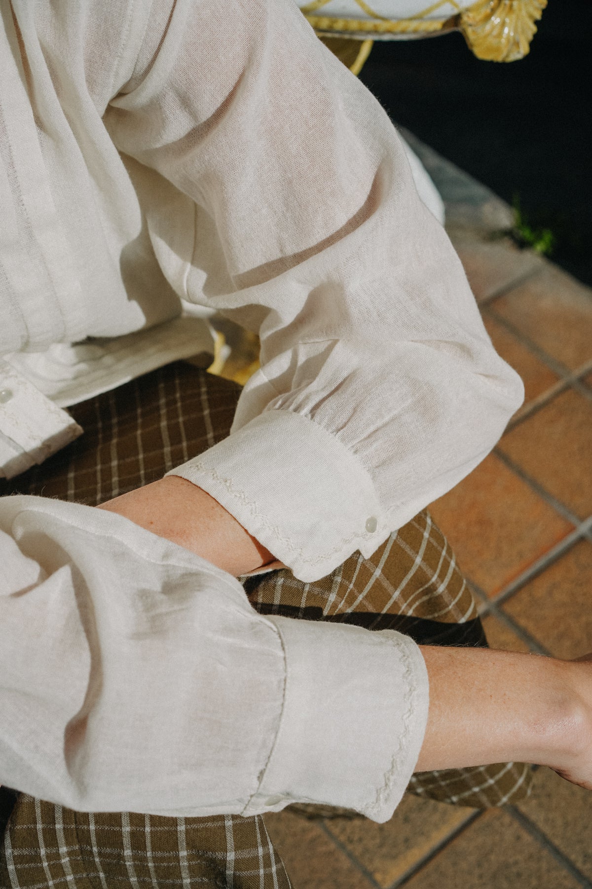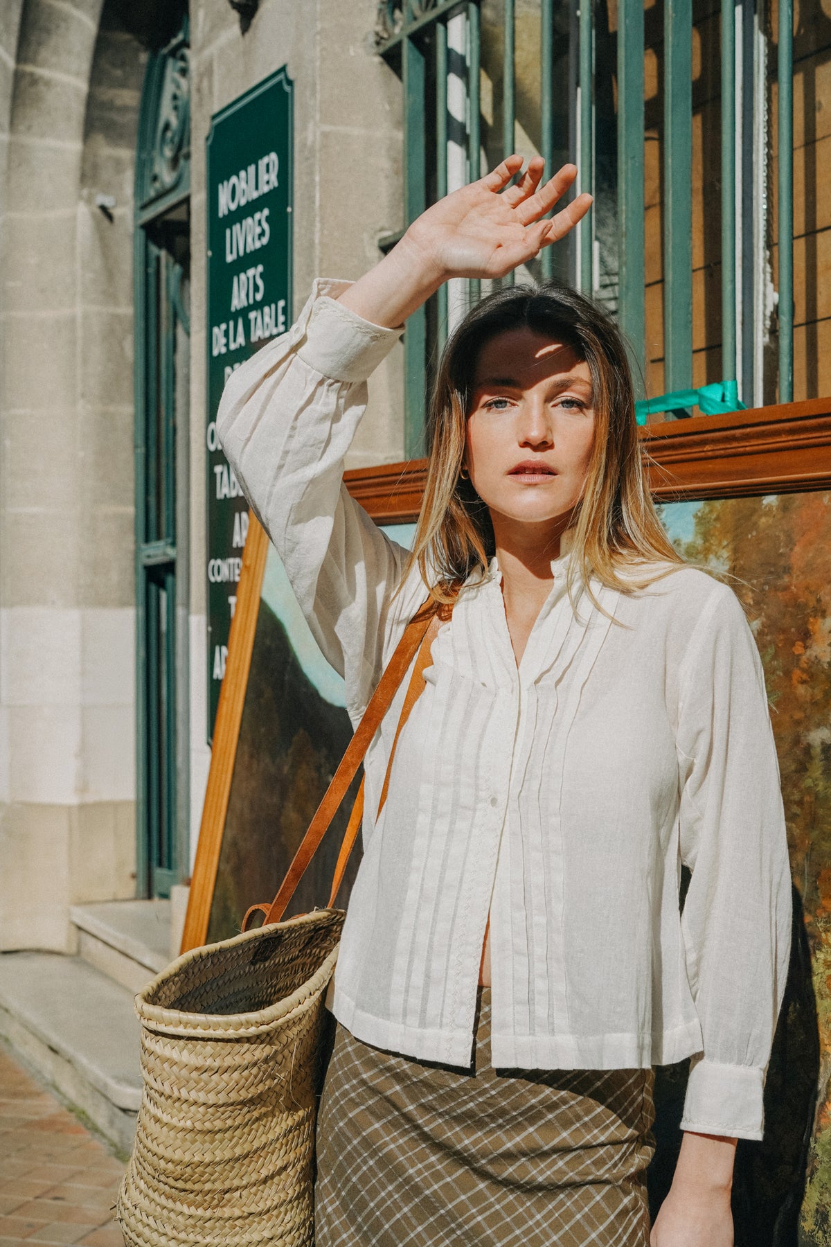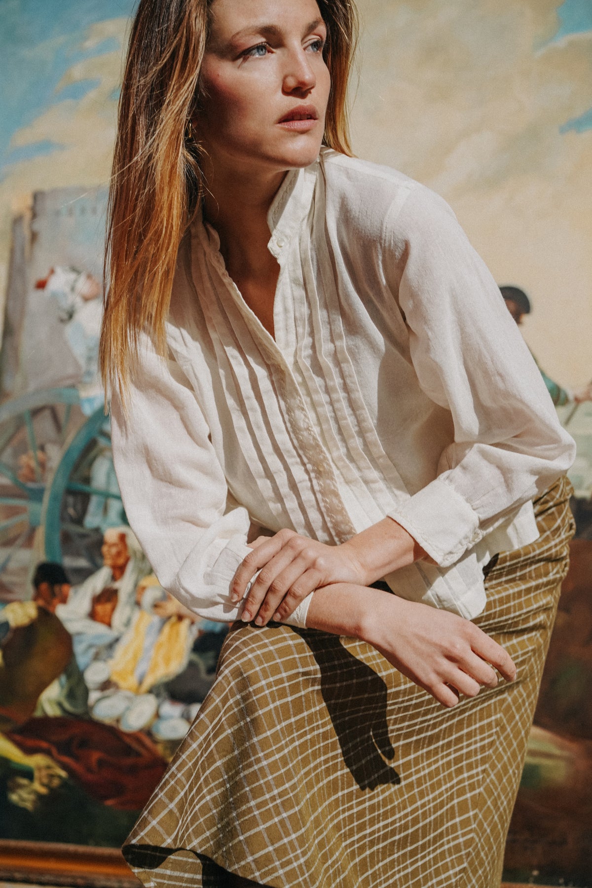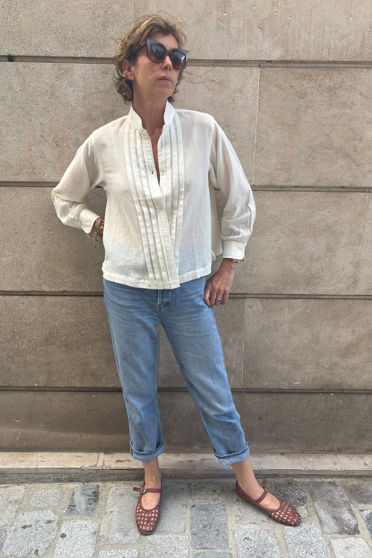 Blouse vintage avec plastron plissé et boutonnage en perle. Petit col cassé et poignet manches trois quart.