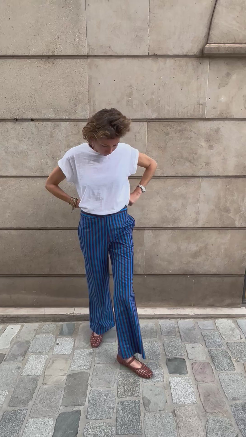 Pantalon large à rayures bleues et violettes avec zip et taille haute. Bas un peu évasé.