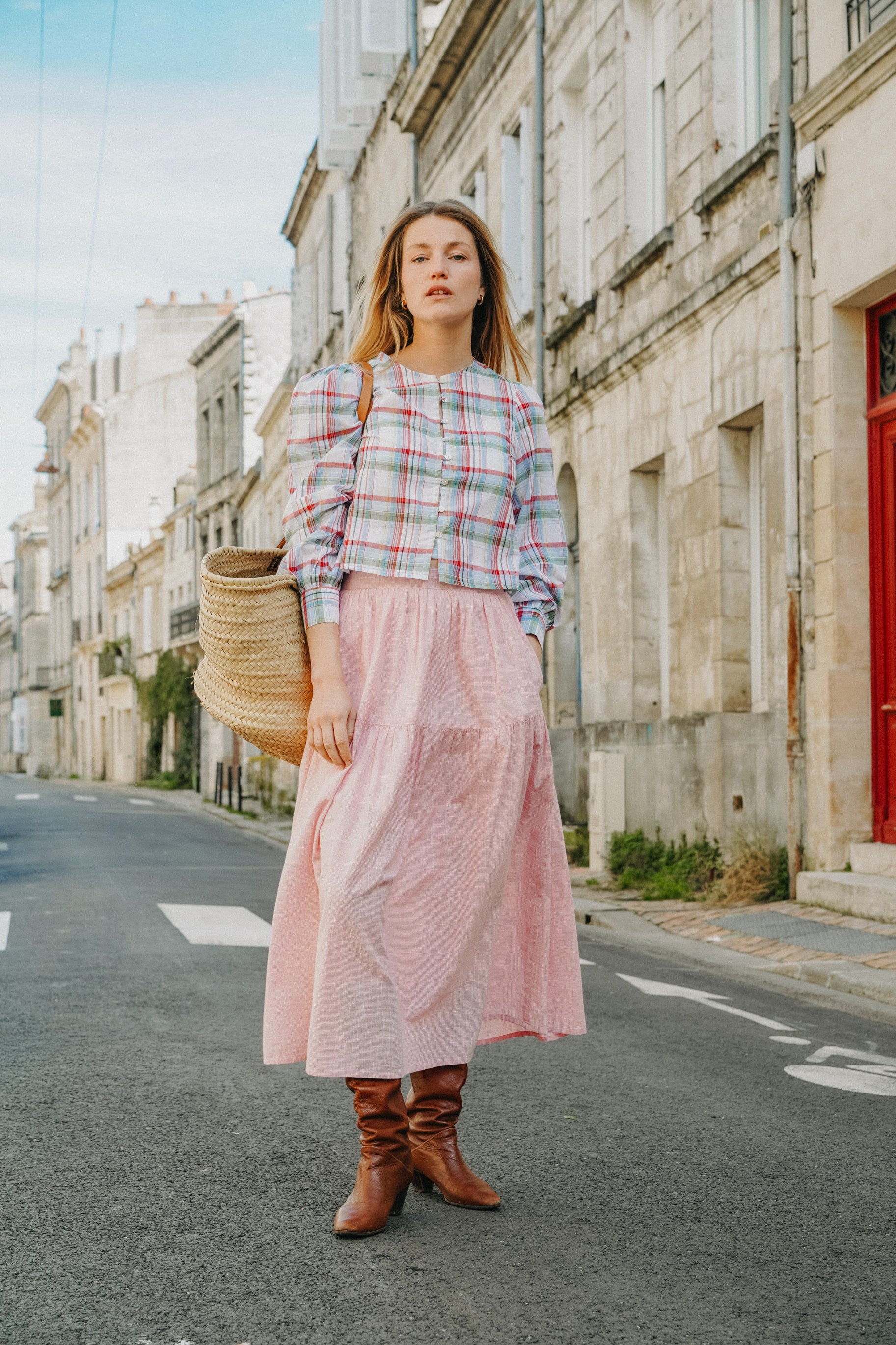 Jupe à volutes et ceinture froncée et smocks à la taille. Dans un tissu en coton crinckle ivoire et en série limitée. A porter aussi en robe bustier.