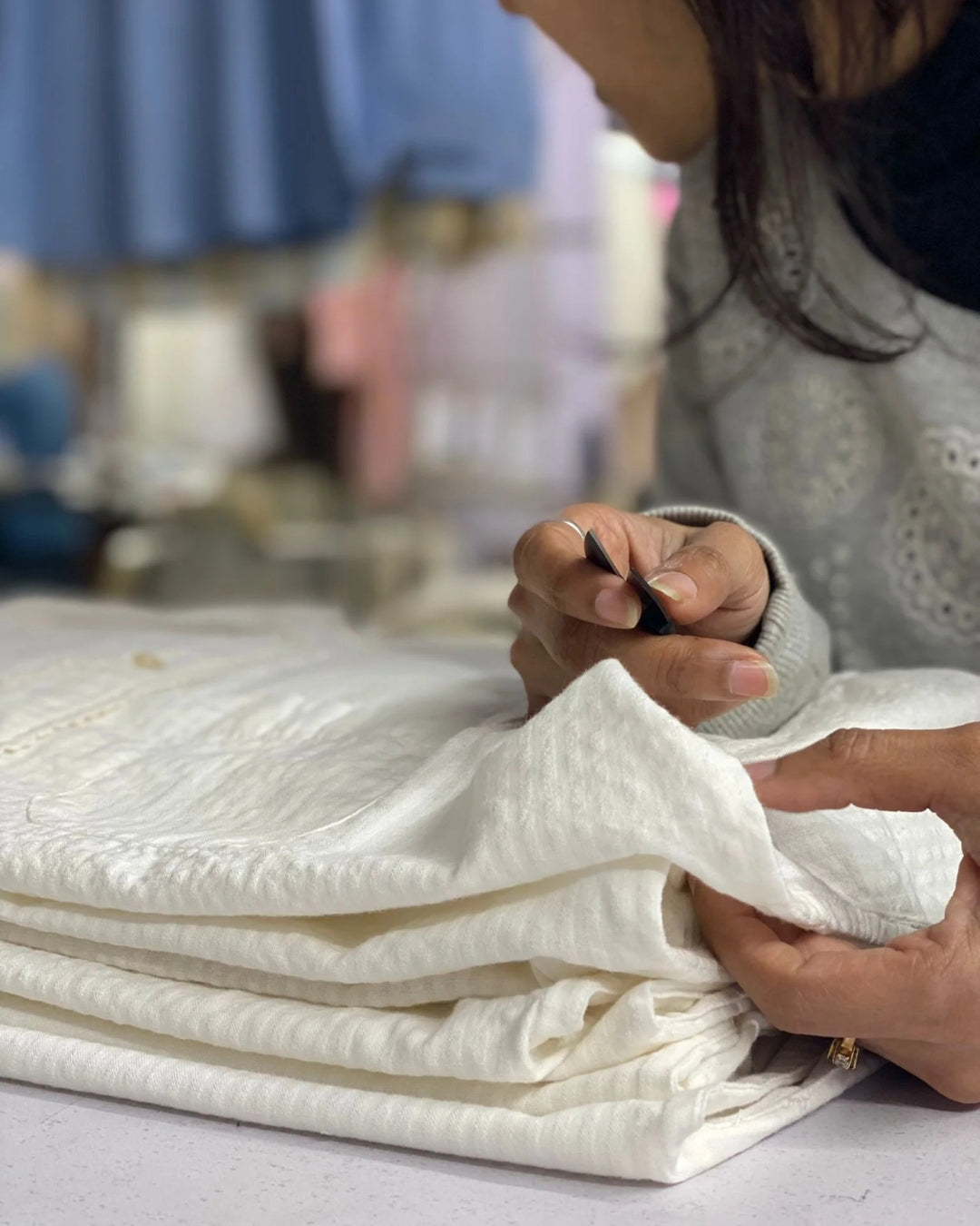 Chaque pièce est une histoire tissée avec soin dans des ateliers en Inde, où la broderie et les incrustations de dentelle sublime chaque création. Nous avons la chance de collaborer avec des artisans au savoir-faire unique. Les pièces en maille, quant à elles, sont fabriquées dans un atelier en Turquie.