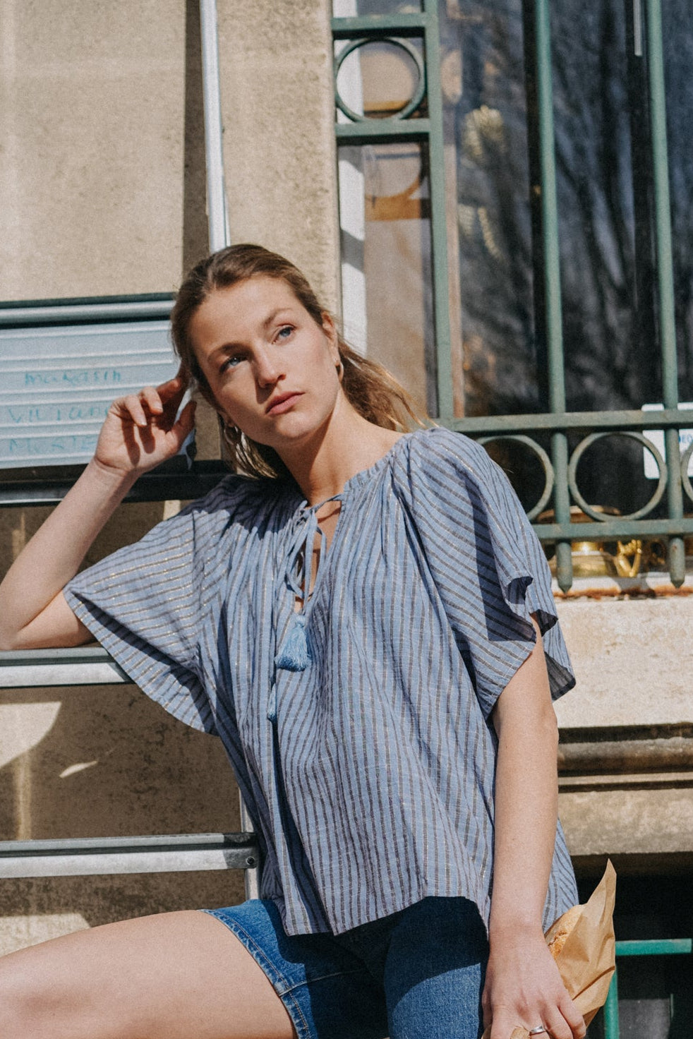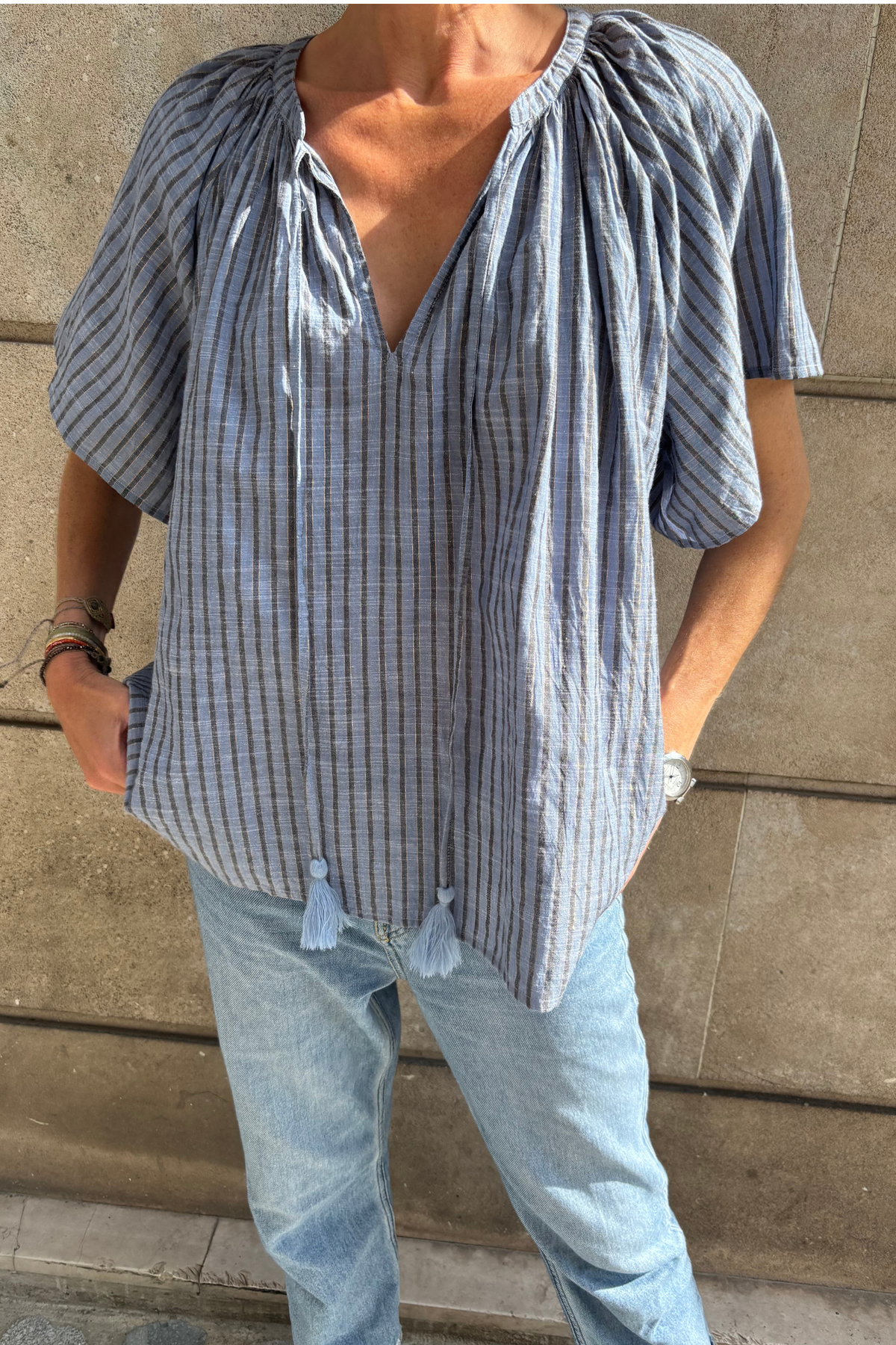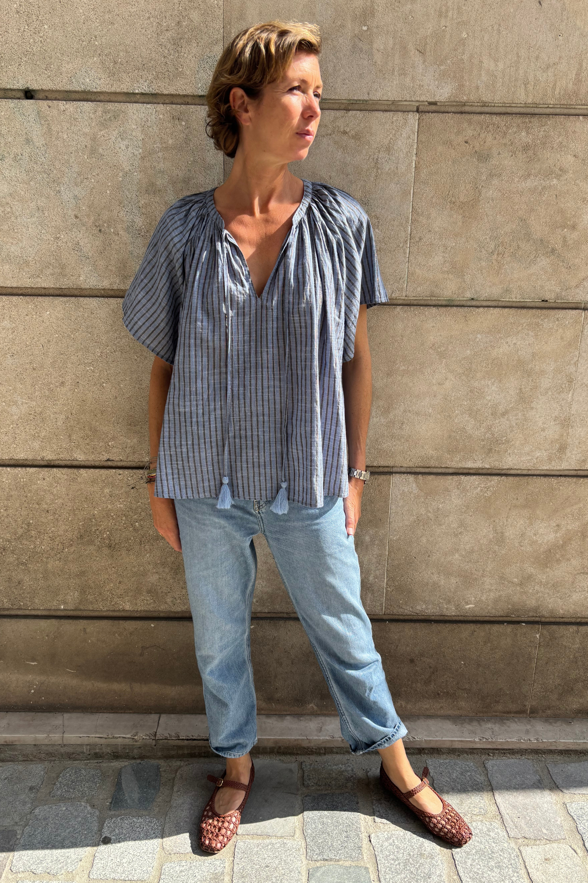 La blouse Bethany est réalisée dans une magnifique matière coton toute douce bleu nuit, bleu ciel et lurex. La forme très vaporeuse et féminine et très agréable à porter pour tout l'été.