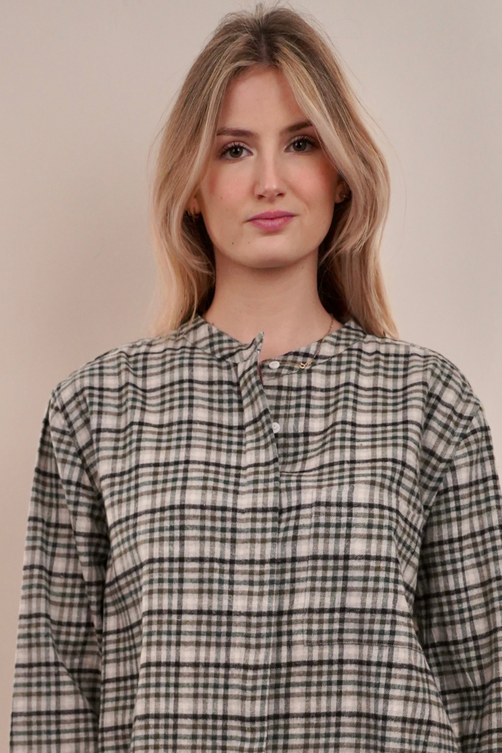 Blouse coupe droite, col mao boutons en nacre. Patte de boutonnage pour effet boyfriend blouse. Tissu effet brossé.